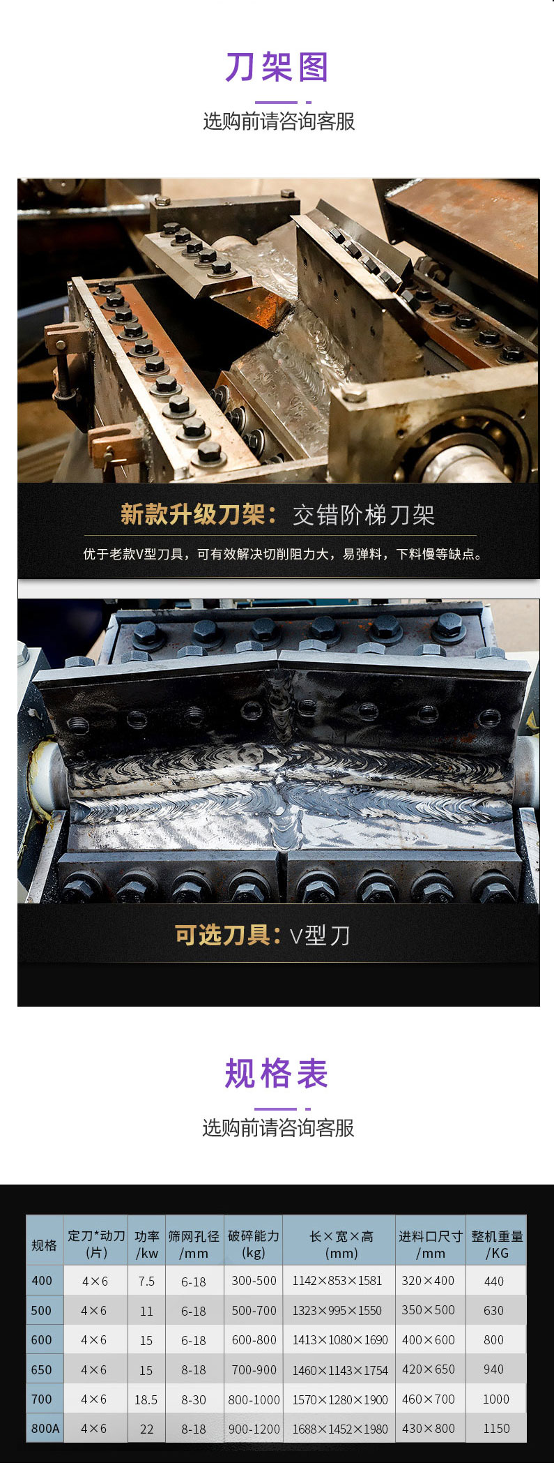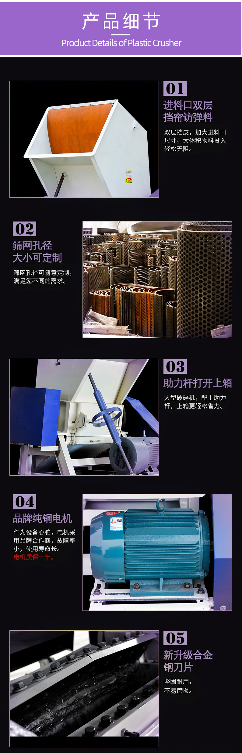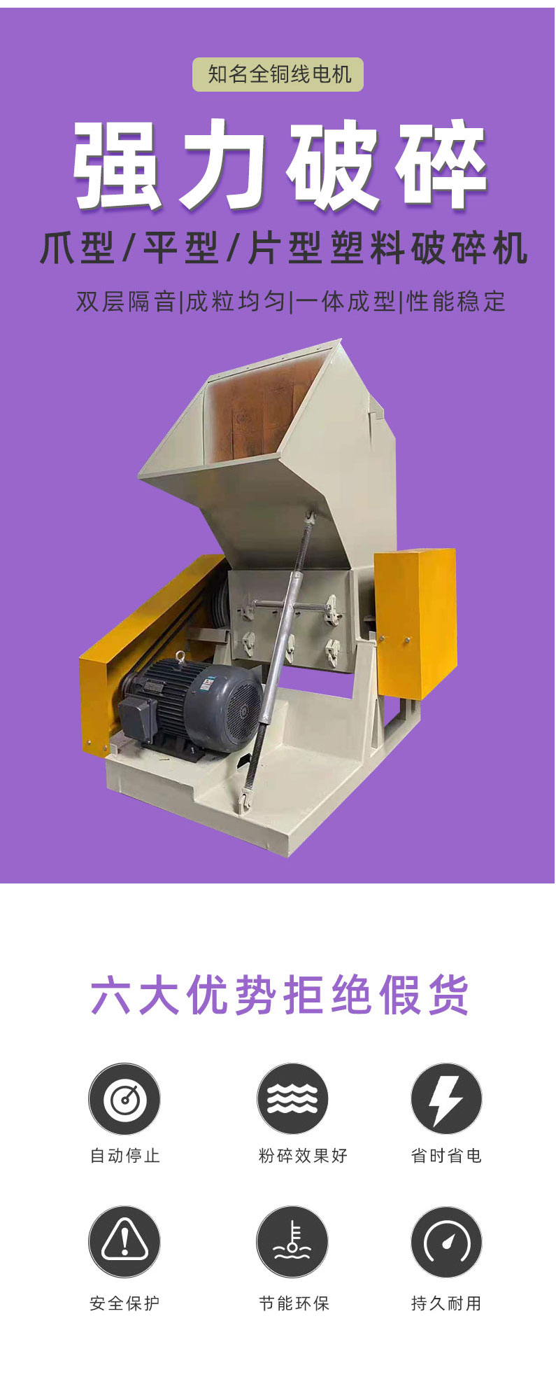 塑料破碎機(jī),大型塑料破碎機(jī)的特點(diǎn)強(qiáng)力破碎機(jī)刀具采用名廠優(yōu)質(zhì)精鋼精工而制,特別堅(jiān)固耐用,粉碎各類軟、硬塑膠,輕松容易。前后隔音防音設(shè)計(jì),噪音極小。設(shè)計(jì)精簡(jiǎn),占地特少,維護(hù)容易。門較式分離設(shè)計(jì),清掃換網(wǎng)特別容易。馬達(dá)裝有過(guò)荷保護(hù)與電源連鎖保護(hù),保護(hù)馬達(dá)、刀具、工作人員。制造工藝成熟、機(jī)體、刀架等主要部件采用整體加工,確保配合精度。粉碎膠頭、薄膜,有特別粉碎機(jī)供選擇,以更好的適應(yīng)。